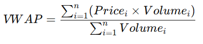 Volume-Weighted Average: VWAP is calculated by taking the sum of the dollar value of all trades (price multiplied by volume) over a specific time period and dividing it by the total volume of trades during that period. This gives more weight to prices where higher volumes of trades have occurred, making it more reflective of the actual market activity.